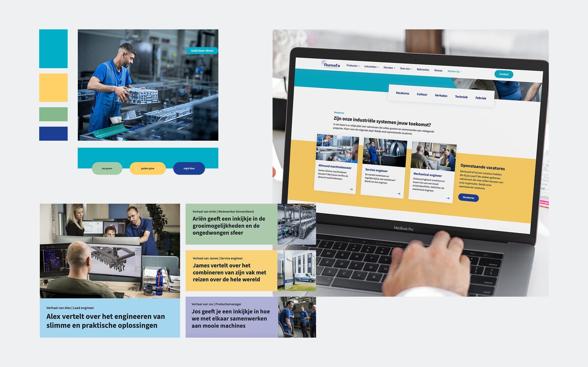 De werken-bij omgeving van Numafa kreeg een inhoudelijke en visuele upgrade binnen de bestaande corporate website. Omdat kandidaten een andere doelgroep vormen dan leads, ontwikkelden we een eigen stijl die subtiel afwijkt van de corporate uitstraling. Zachte waarden als teamgevoel, vrijheid en persoonlijke groei kregen daarin nadrukkelijker de ruimte, zonder de technische kracht van Numafa uit het oog te verliezen.