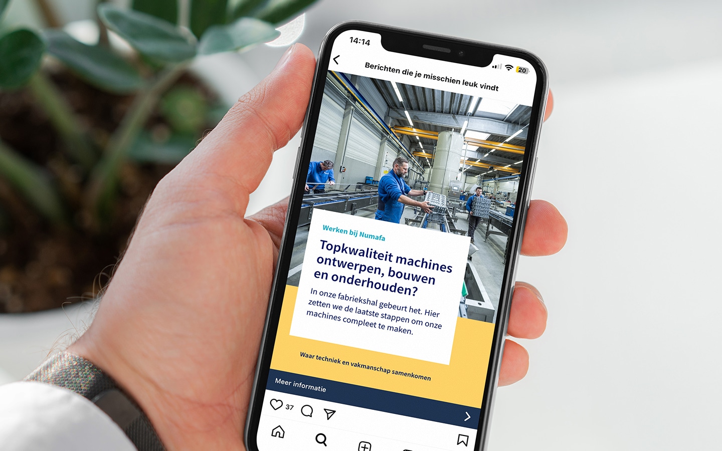 We startten met een strategische verkenning: waar wil Numafa naartoe en wie hebben ze daarvoor nodig? In workshops met HR en het managementteam brachten we samen de kern boven tafel. Numafa zoekt vakmensen met een sterk technisch profiel: fabrieksmonteurs, service engineers en mechanical engineers. Mensen die verantwoordelijkheid willen nemen, pragmatisch zijn en goed functioneren in een team. Stefan de Jong, manager operations wist goed te benoemen wat werken bij Numafa inhoudt: “Werken bij Numafa betekent een job for a lifetime, waarbij je met mooie technieken fantastische machines bouwt waar je hart sneller van gaat kloppen.” Aan ons de taak om dat over te brengen op de doelgroep.